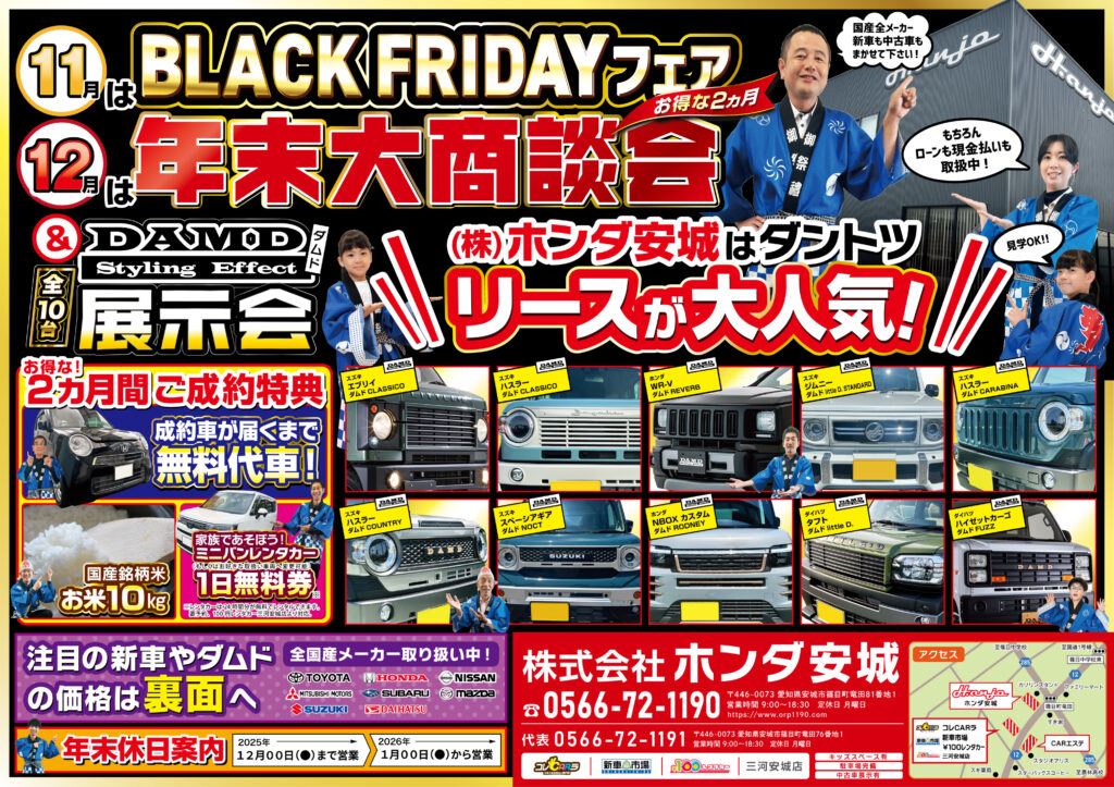 株式会社ホンダ安城 車両販売部 0566-72-1190 月曜日定休 9時から18時30分まで