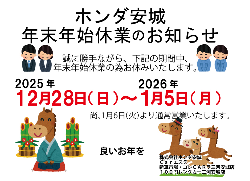 2025-2026年末年始休業のご連絡ホンダ安城 年の瀬が迫り、今年も残りわずかとなってまいりました。皆様には本年もご厚情を賜り、心より感謝申し上げます。 来年も変わらぬご愛顧を賜りますようお願い申し上げます。 よいお年をお迎えください。 新年の営業は1月6日火曜日より通常営業となります。